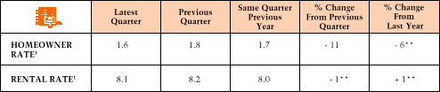 The 1999 second-quarter national rental vacancy rate, at 8.1 percent, decreased a statistically insignificant 0.1 percentage point from the first quarter of 1999, and was up a statistically insignificant 0.1 percentage point from the level of the second quarter of 1998. The homeowner vacancy rate, at 1.6 percent, was down 0.2 percentage point from the first quarter of 1999 and was down a statistically insignificant 0.1 percentage point from the second quarter of 1998.